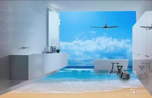 3. Berasa kayak lagi mandi di tengah alam bebas nih dengan desain lantai rumah 3D bertema pinggir pantai.