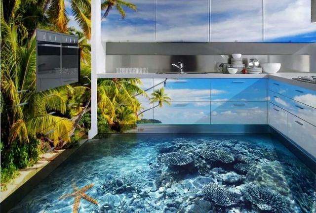 8. Dipasang di bagian dapur, lantai rumah 3D bertema laut ini bikin kamu jadi berasa masak di pinggir pantai.