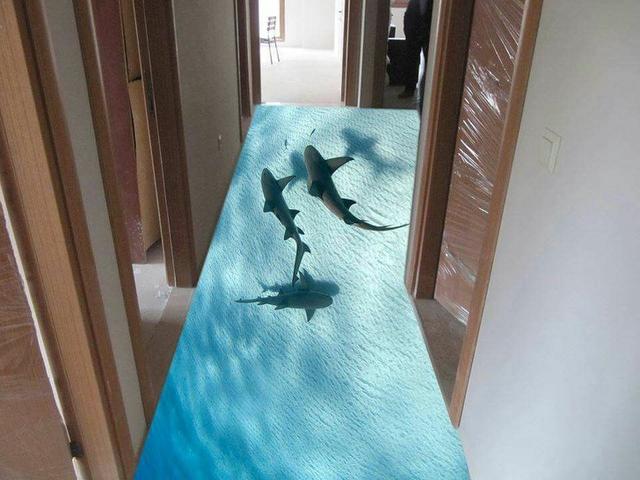 11. Lorong-lorong rumah pun jadi terlihat makin kece dengan desain lantai rumah 3D bertema laut ini.