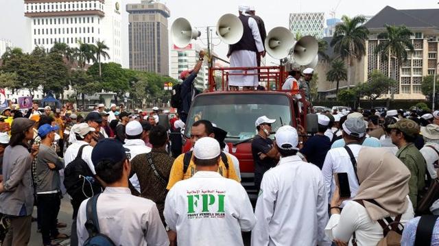 Massa Front Pembela Islam (FPI) mengawal sidang perdana sengketa Pilpres 2019 yang diajukan Capres dan Cawapres nomor urut 02 Prabowo - Sandiaga di MK. (Suara.com/Novian Ardiansyah)