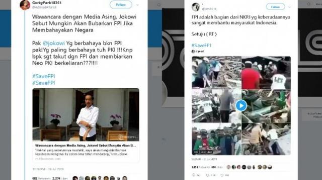 Pak @jokowi yang berbahaya bukan FPI Pak! Yang paling berbahaya tuh PKI! Kenapa Bapak sangat takut dengan FPI dan membiarkan Neo PKI berkeliaran? #SaveFPI," tulis @AchmadAlfaris6.